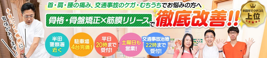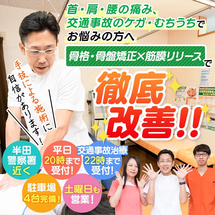 皆様のお体に関するお悩みが一日でも早く解決するようサポートさせていただきますので、お体のお悩みがおありの方は一度半田市にある当院までご相談ください。